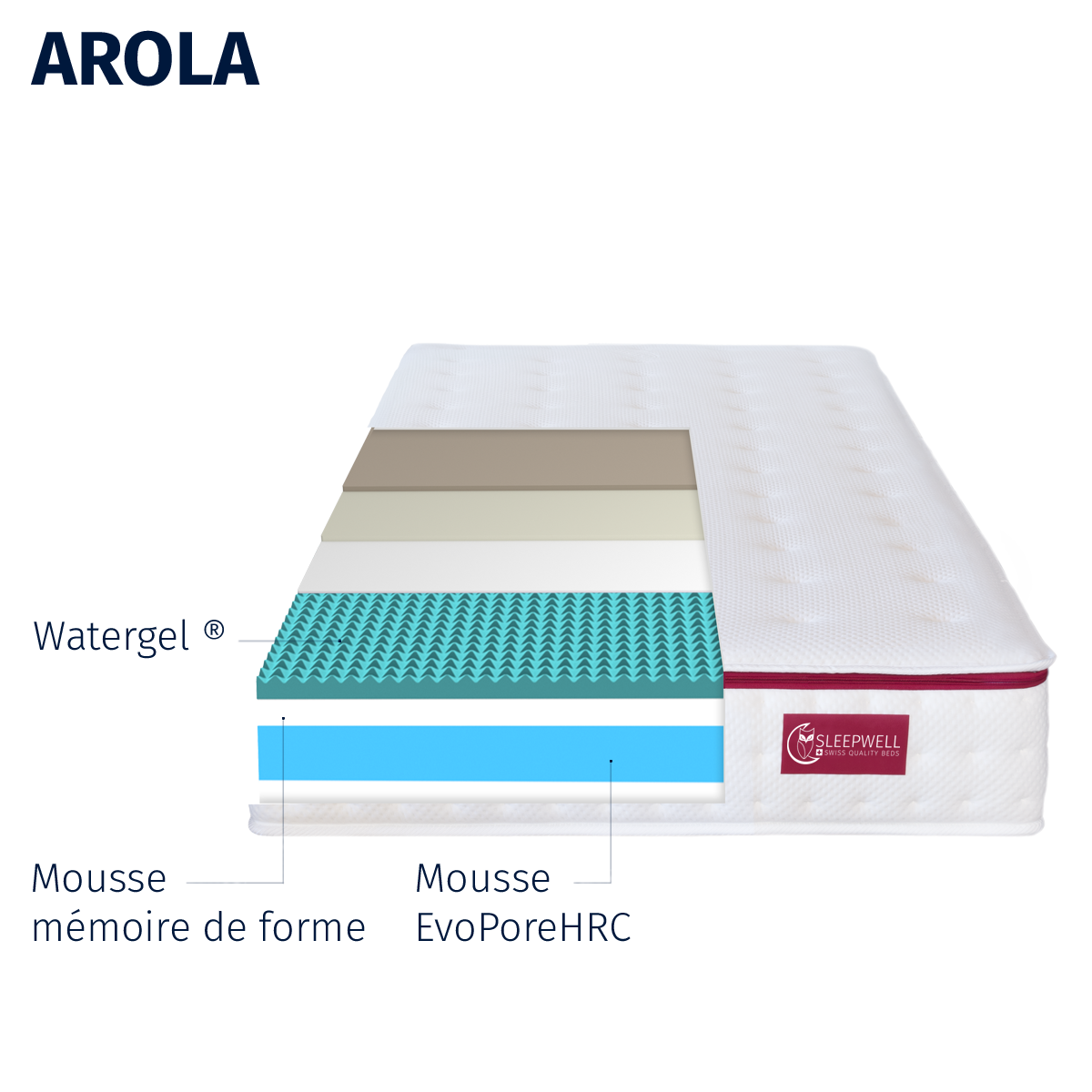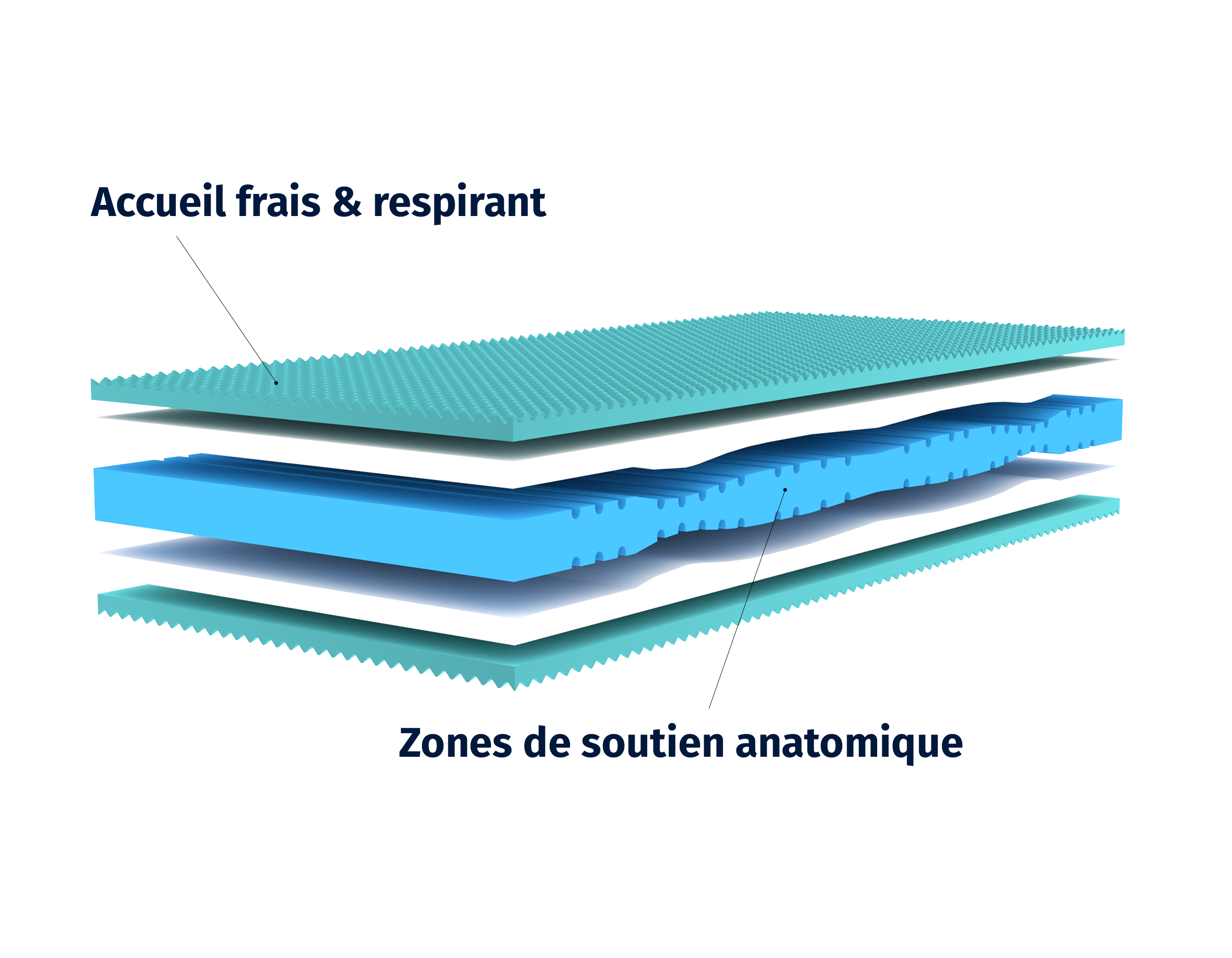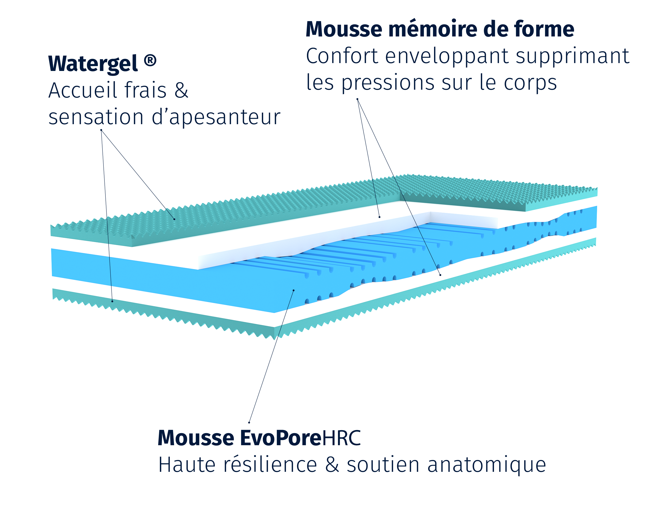 Corps en mousse mémoire de forme alvéolée qui mémorise la morphologie du dormeur, ce matelas garantit un ajustement anatomique harmonieux parfaitement réparti sur les 7 zones de confort. Il est complété par une couche Watergel®, une mousse révolutionnaire, ultra-respirante qui procure une agréable sensation d’apesanteur. Ce procédé offre un sommeil allégé, une douceur au contact et un climat de repos agréable.